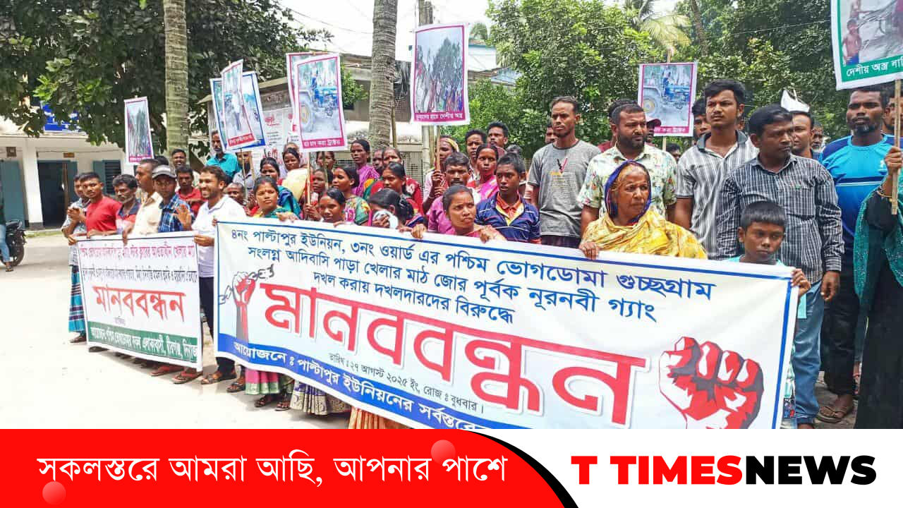দিনাজপুরের বীরগঞ্জ উপজেলার পাল্টাপুর ইউনিয়নের পশ্চিম ভোগডোমা গুচ্ছগ্রাম সংলগ্ন আদিবাসী পাড়ার খেলার মাঠ জোরপূর্বক দখল করার অভিযোগে নূরনবী গ্যাংয়ের বিরুদ্ধে মানববন্ধন অনুষ্ঠিত হয়েছে।